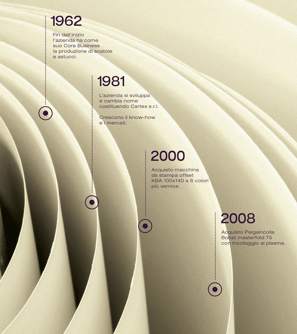 Fin dalla sua fondazione, avvenuta nel 1962, l’azienda ha avuto il suo core business nella produzione di scatole e astucci in cartoncino teso e accoppiato, mettendo a frutto l’esperienza in ambito tipografico. Ben presto l’attenzione si concentra sui prodotti di alta gamma, accrescendo man mano la propria reputazione nel settore.