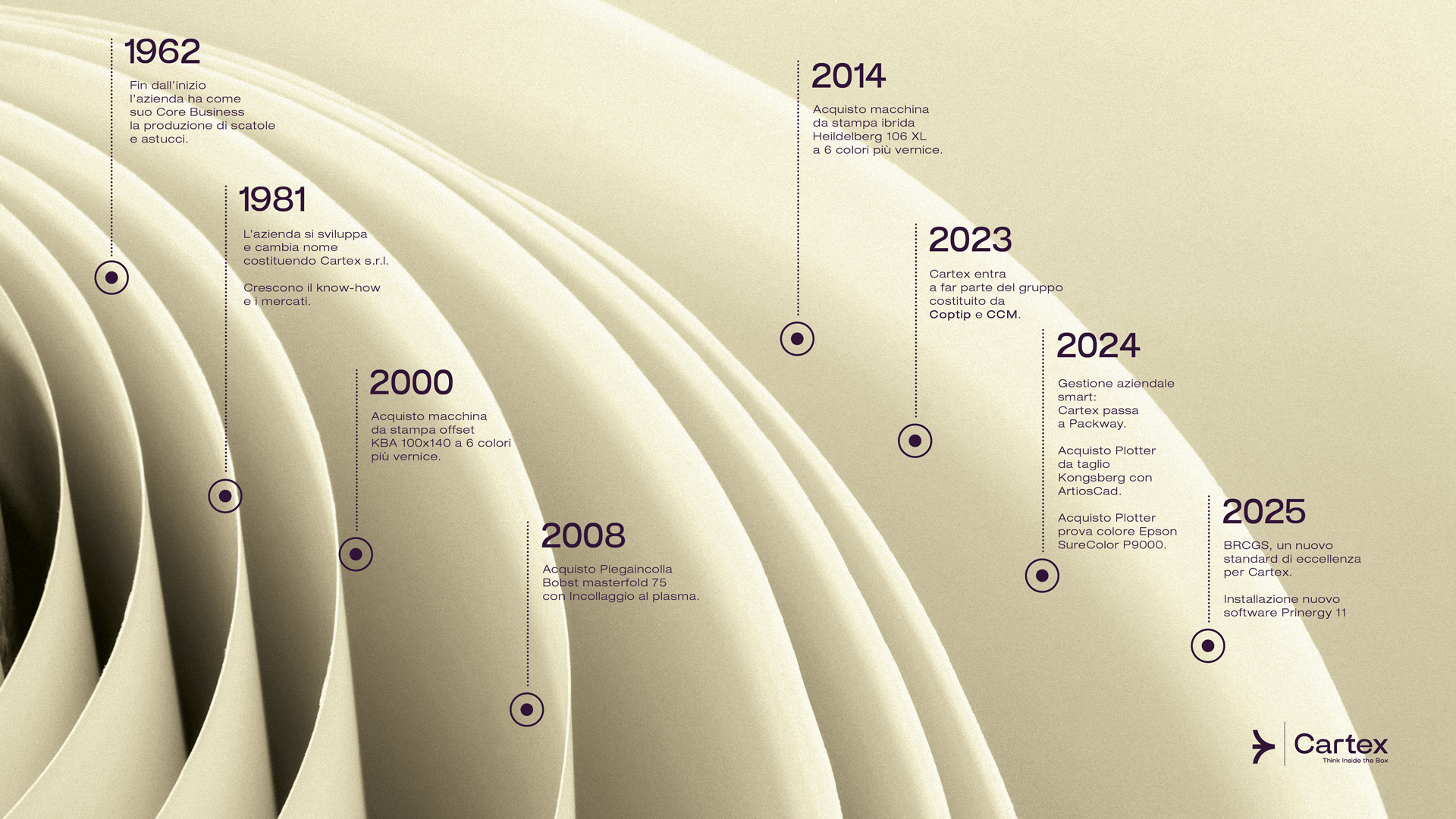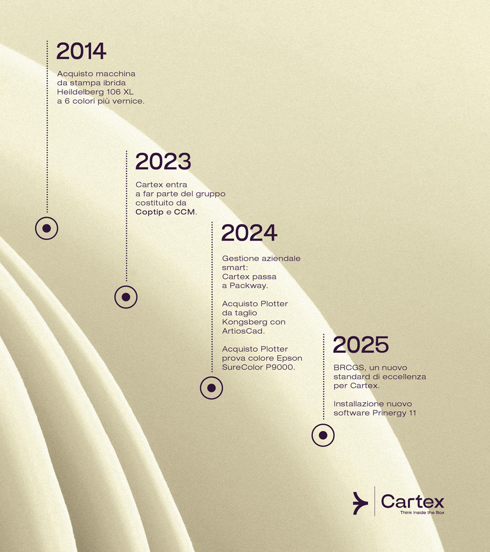Nel 2023 Cartex viene acquisita al 100% da Coptip e CCM, due realtà che condividono un importante progetto nella produzione di packaging, mettendo a fattor comune le rispettive competenze tecniche e commerciali. L’expertise di Cartex diventa così parte di un sistema integrato in grado di intercettare le esigenze della Food Valley e di altri distretti produttivi italiani, con un ruolo di referente unico per il packaging dell’industria.